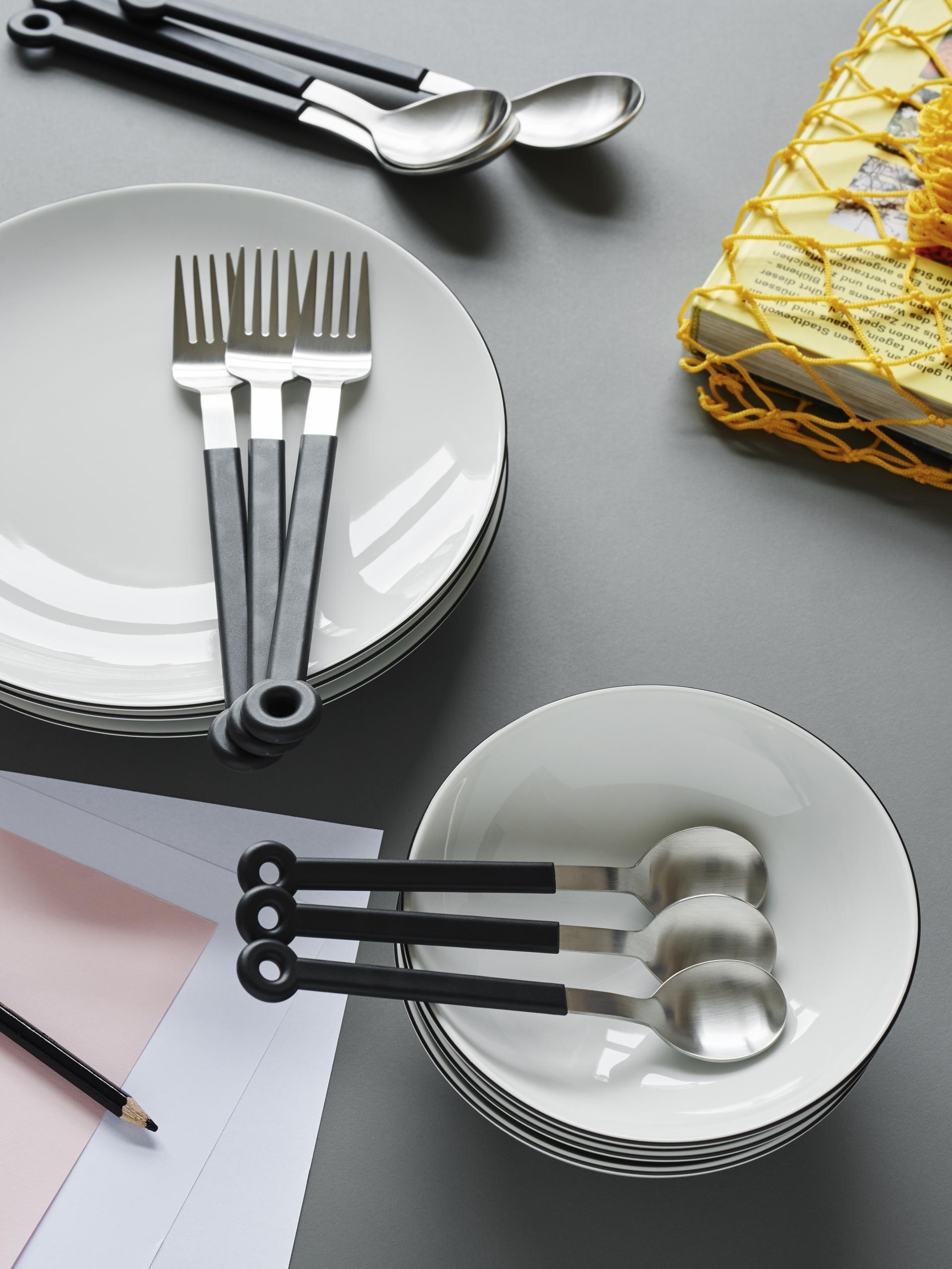 This 5 piece Mono Ring set with black handles includes dinner spoon, dinner fork, dinner knife, tea spoon and dessert fork.