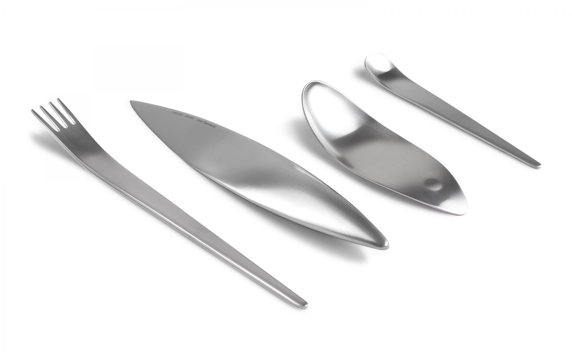 The tools of prehistoric man were the inspiration for the shapes. A hand ax was the inspiration for the knife, the slender fork is reminiscent of early spear tools and the spoon is reminiscent of a scooping hand. Thus, Mono Zeug is not only an anniversary cutlery, but also a homage to the home of the cutlery manufacturer: Mettmann, the place where the Neanderthals were found.