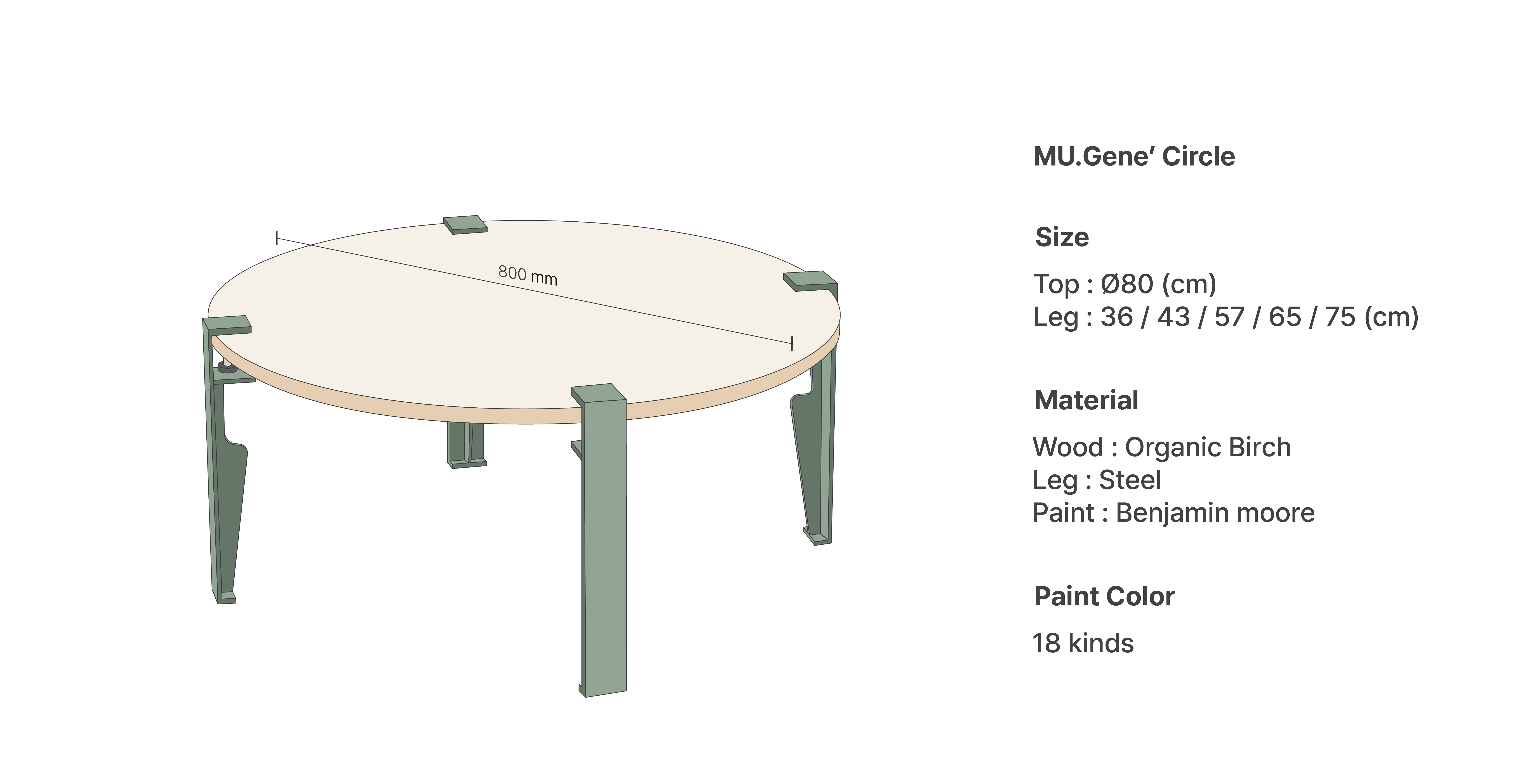 MU. Gene' Circle (뮤젠 써클)의 경우, Table Top x 1, Leg x3 또는 Table Top x 1, Leg x4 로 구성됩니다.