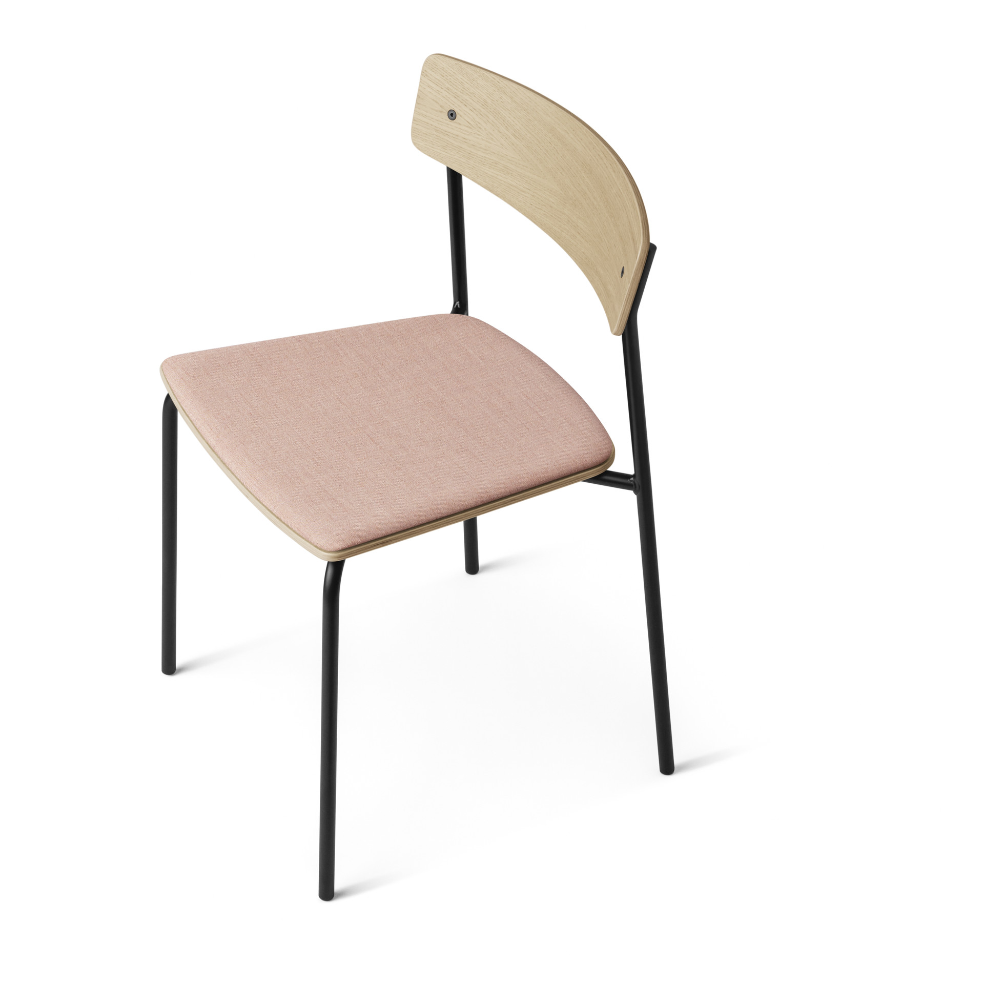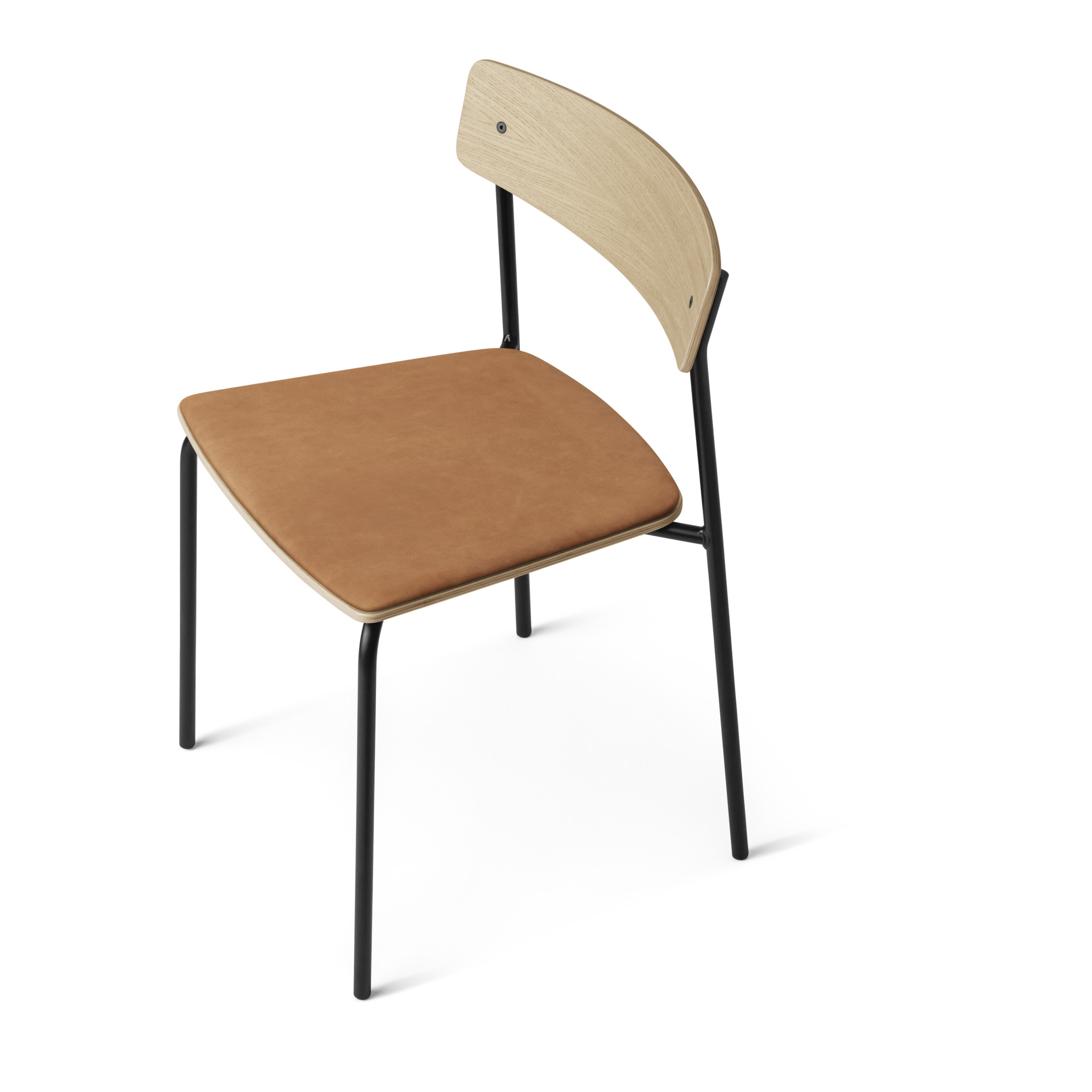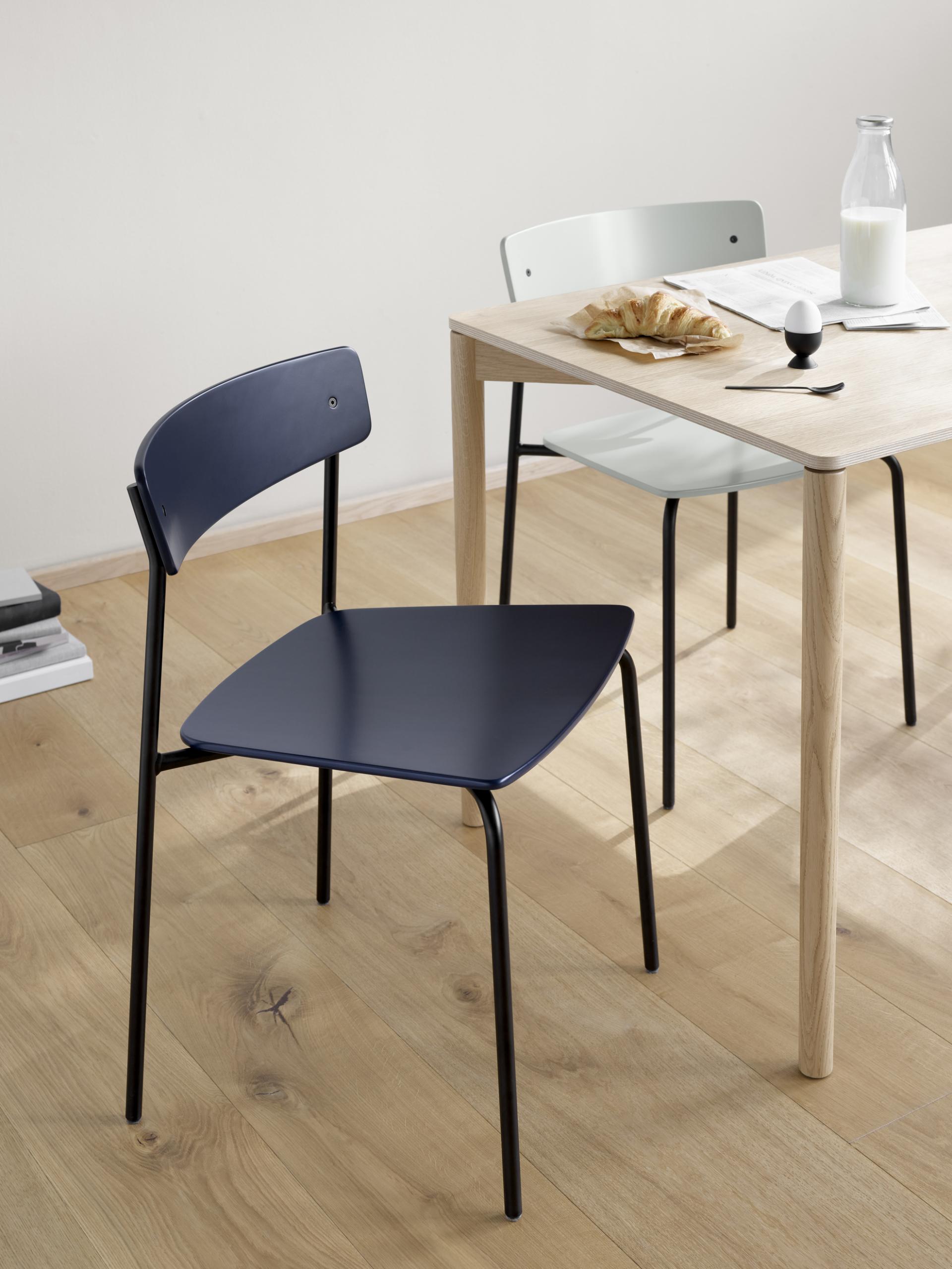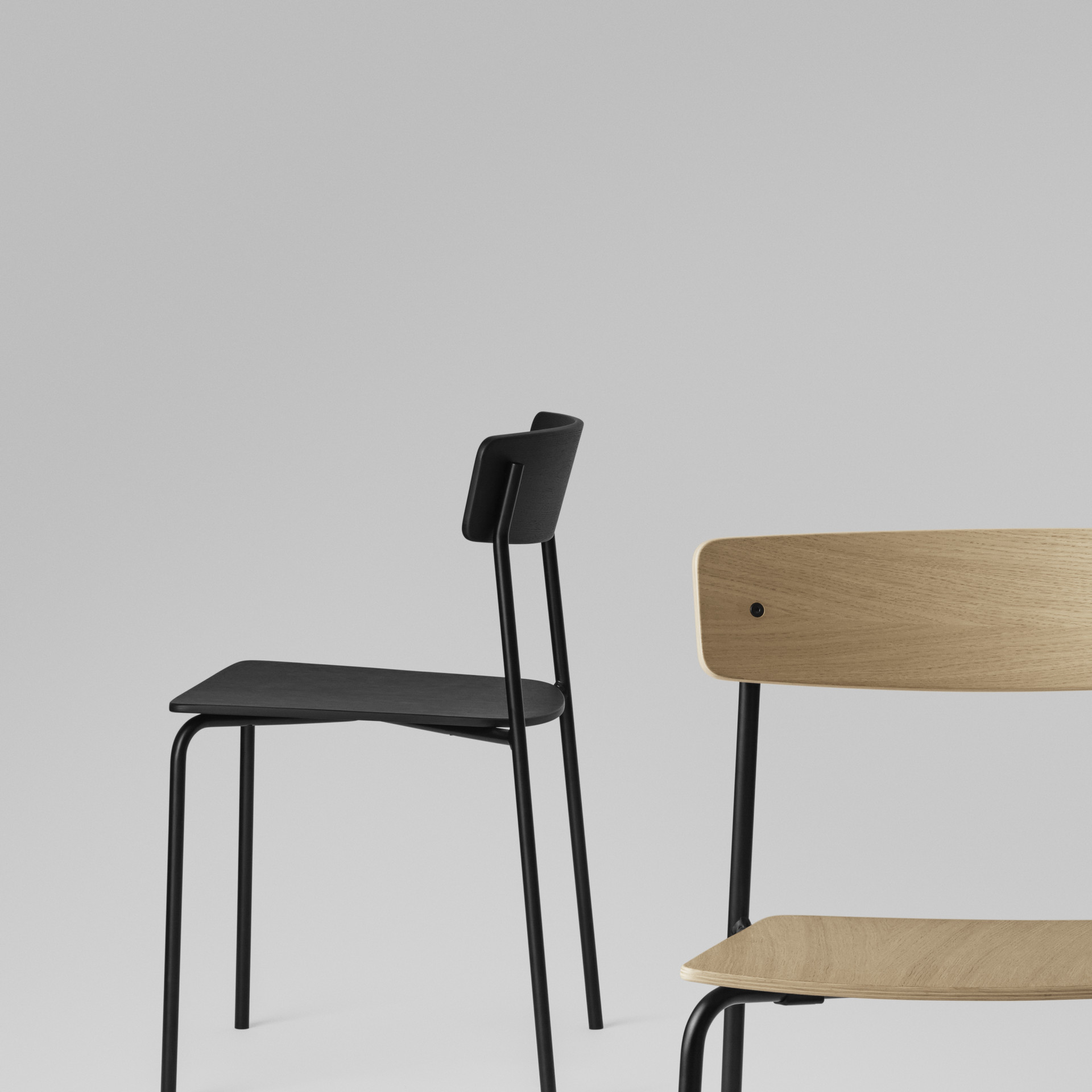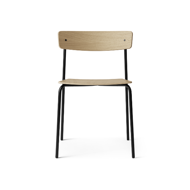 The chair introduces a material contrast to the oak wood of the backrest and seat, and it creates a more slender and lightweight silhouette without sacrificing strength. Furthermore, the use of a metal frame allows multiple chairs to be stacked easily for storage.