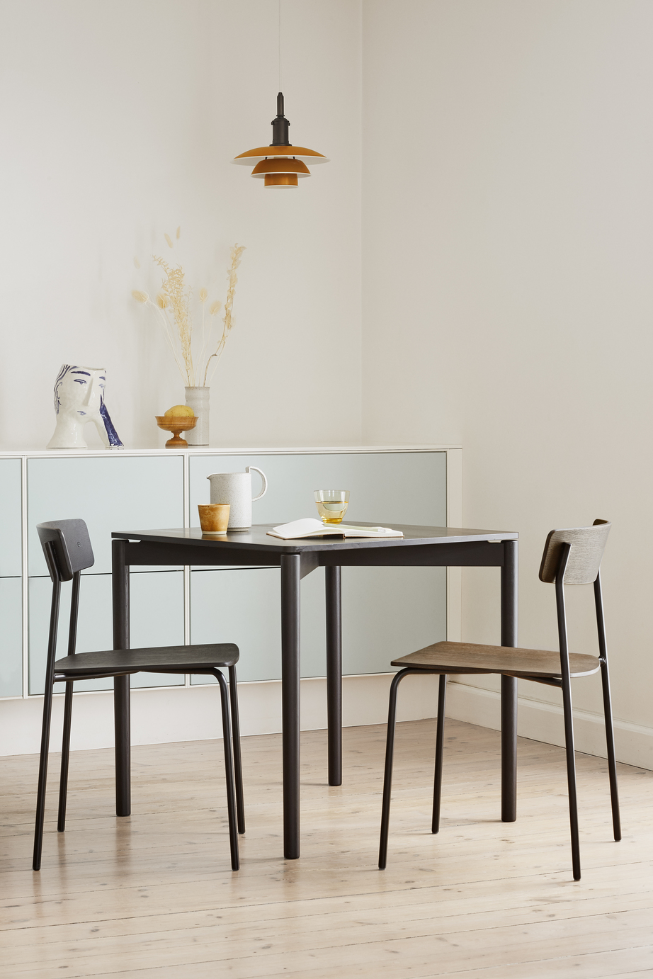 Cross Chair Tube shares the same lightweight visual language and assembly method with its predecessor, Cross Chair, but is materially distinct. Where Cross Chair features a frame of solid oak, Cross Chair Tube incorporates a frame made of recyclable high-pressure steel with a sturdy black powder coating that adds a graphic and elegant expression.