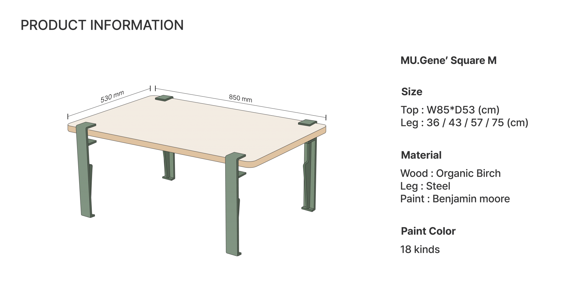 MU. Gene' Square M (뮤젠 스퀘어 M)은 Table Top x 1, Leg x4 로 구성됩니다.