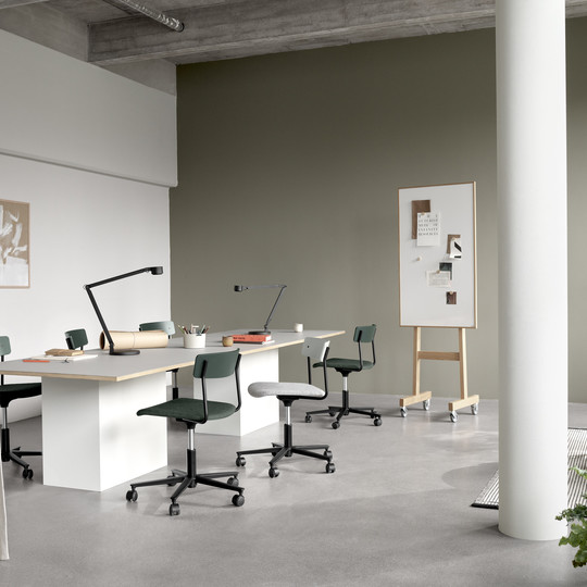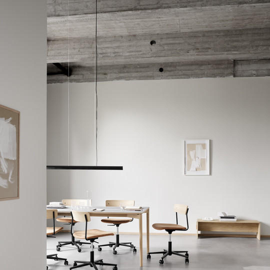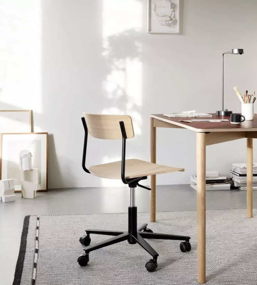 PearsonLloyd’s design takes the lightweight look and elegantly minimal material expression of Cross Chair Tube – with its slim wooden back fitted to parallel tubes of recyclable high-pressure steel – and incorporates the adjustability necessary for a task chair into the wheeled base without compromising its clean and simple appearance.