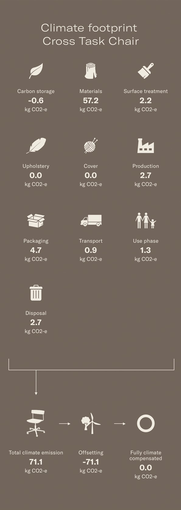 Cross Task Chair is designed through TAKT’s Eco System Design principles and are shipped component based as flat packs. We can pack three times more products in the same volume and therefore minimise CO2e emissions during transportation. Cross Task Chair is eco-certified and produced using wood from sustainable forests and other controlled material, just as the full supply chain is certified. It is constructed for disassembly, meaning that all components are replaceable and worn parts can be replaced.