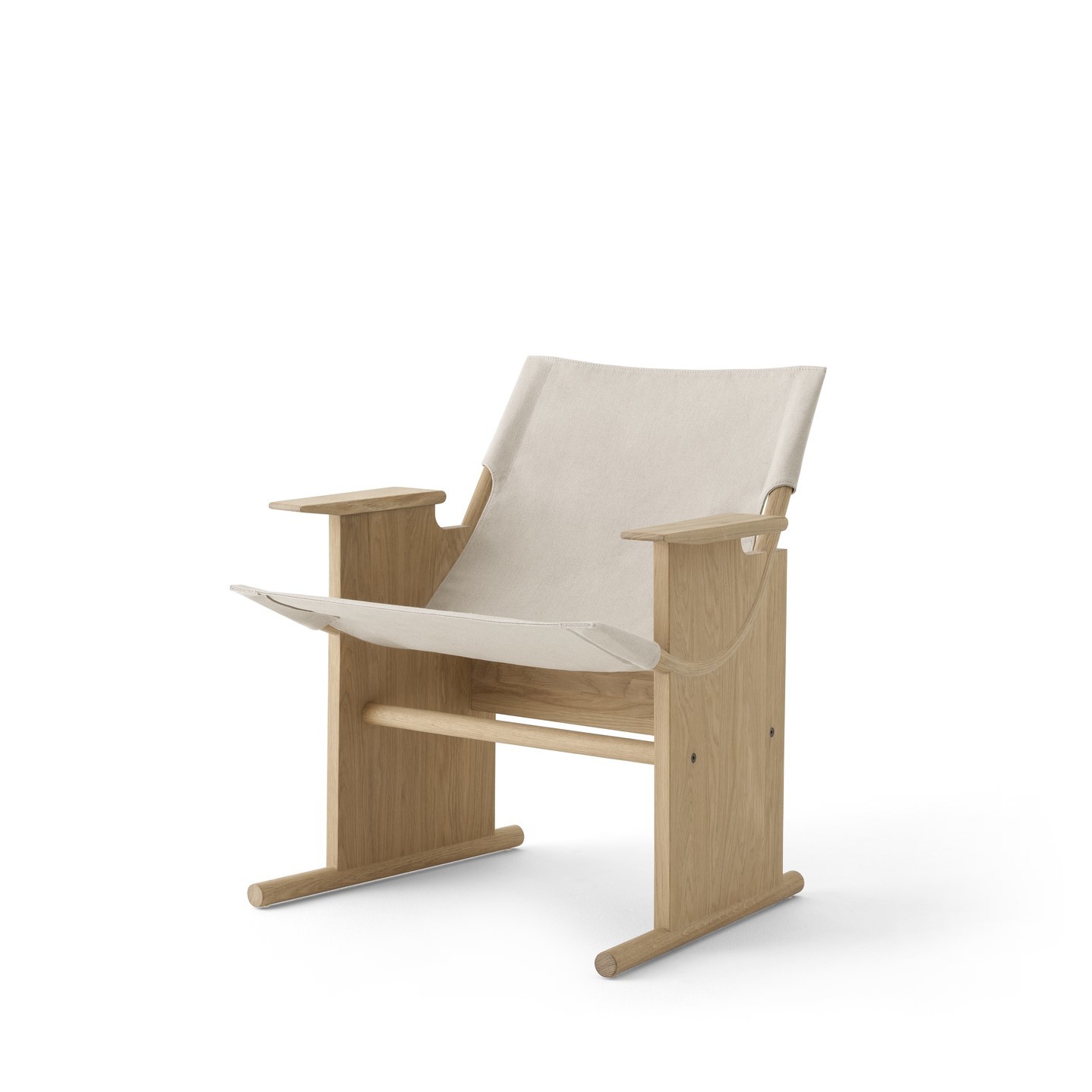 What you see is what you get; solid oak throughout. Made of solid oak planks. Available with or without armrests, and in natural oak and a dusty green. Two sides, two stretchers and a canvas seat in European linen, the chair packs flat to just four wooden pieces. It can be assembled with ease using just four screws, with no need for glue, and readily dismantled for transport. All parts are replaceable, ensuring Sling Lounge Chair can enjoy a long life alongside its owner.