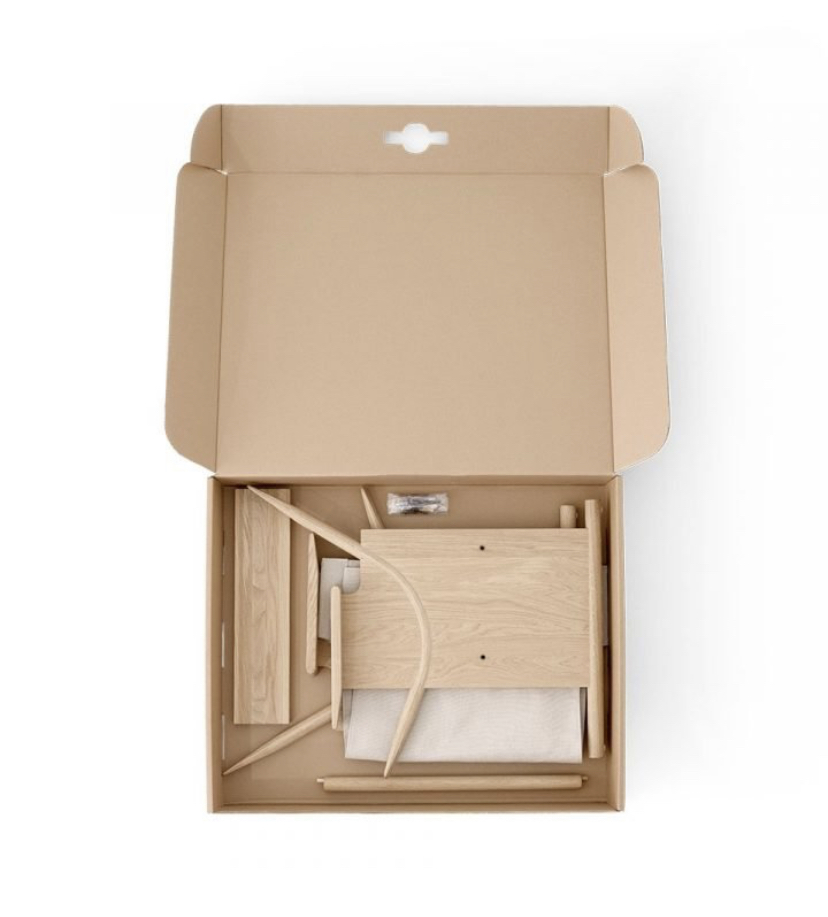 Sling Lounge Chair is designed through TAKT’s Eco System Design principles and are shipped component based as flat packs. We can pack 5 to 7 times more products in the same volume and therefore minimise CO2 emissions during transportation. Sling Lounge Chair is eco-certified and produced using wood from sustainable forests and the full supply chain is certified. It is constructed for disassembly, meaning that all components are replaceable and worn parts can be replaced.