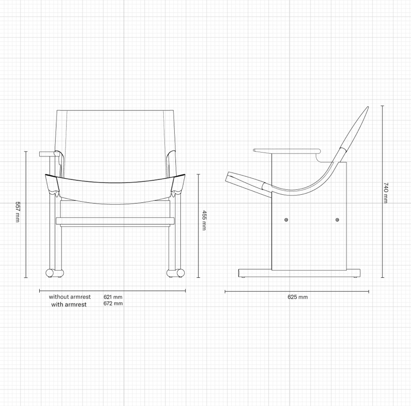 슬링 라운지 체어는 용감하고 새로운 형식적 방향을 제시합니다. 원초적인 형태, 각진 착석 위치, 매달린 패브릭 시트가 특징인 슬링 라운지 체어는 마르셀 브로이어의 바실리 체어에 비유할 수 있지만, 완전히 독특하고 가벼운 것이 특징입니다.