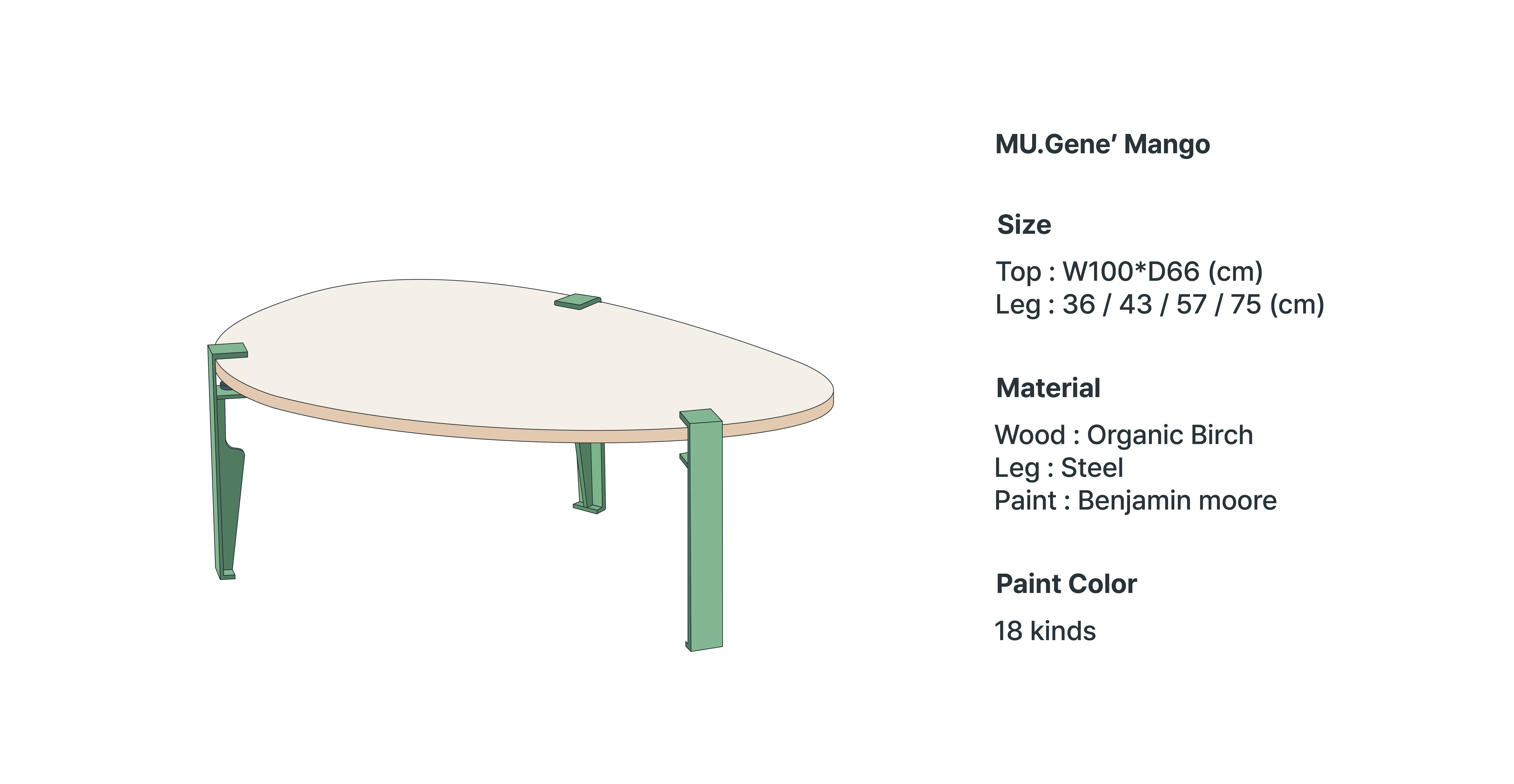 MU. Gene' Mango (뮤젠 망고) 는 Table Top x 1, Leg x3 로 구성됩니다.