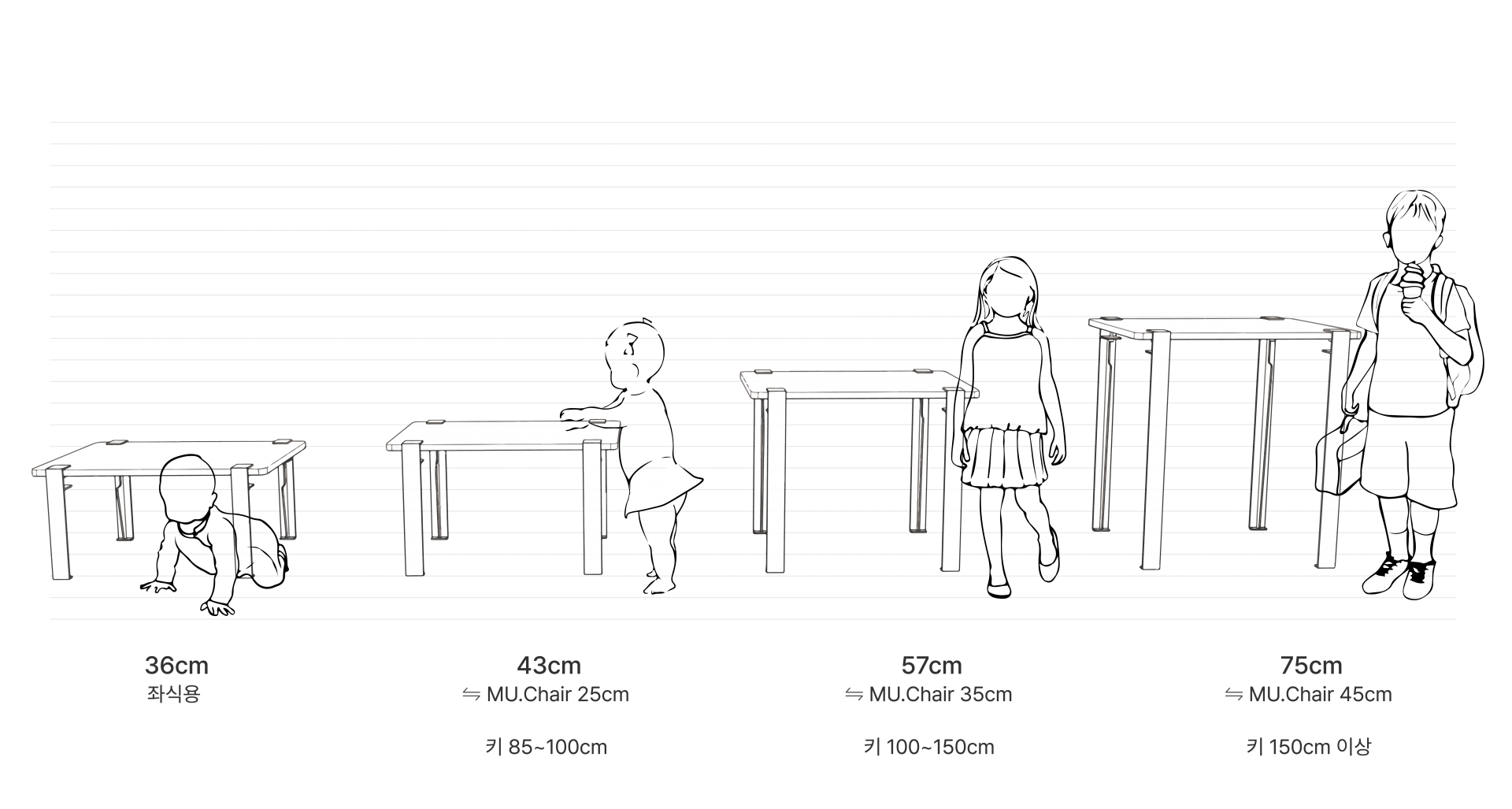 아이들의 키에 따라 추천 드리는 MU.Gene' Table & MU.Chair 높이를 참고해주세요.