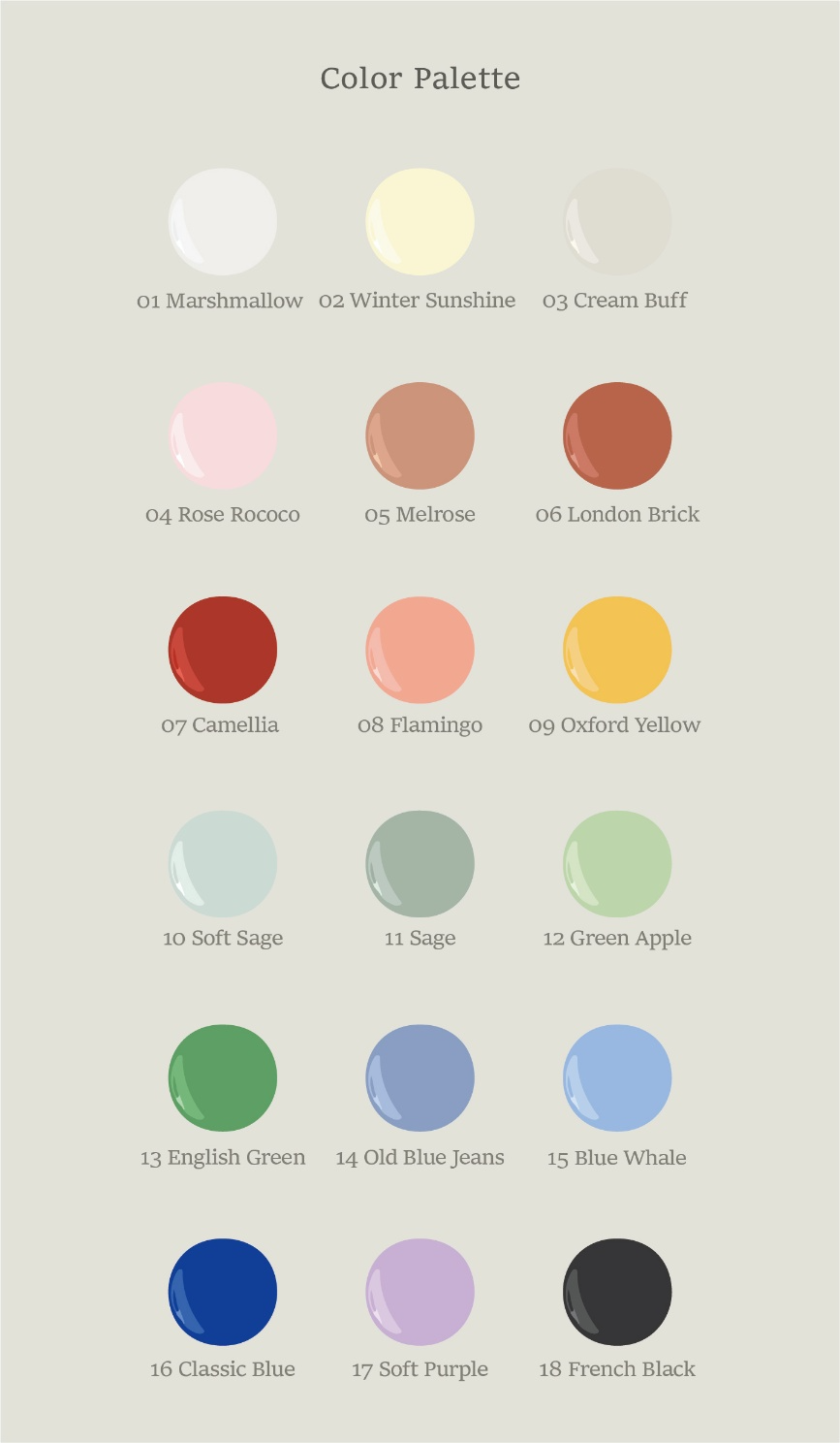 런던브릭, 까멜리아, 플라밍고, 옥스퍼드 옐로우, 소프트 세이지, 세이지,