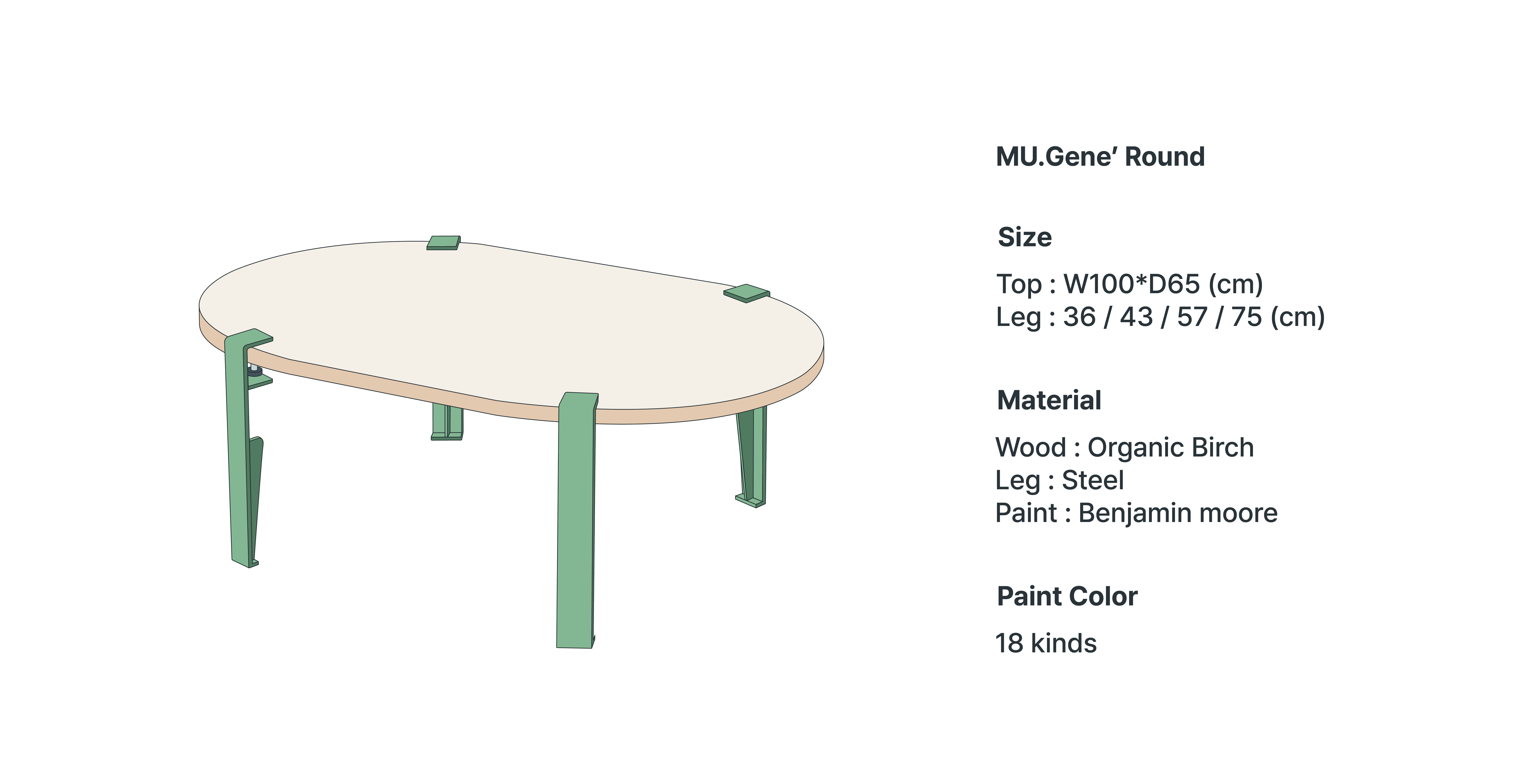 MU. Gene' Round (뮤젠 라운드)는 Table Top x 1, Leg x4 로 구성됩니다.