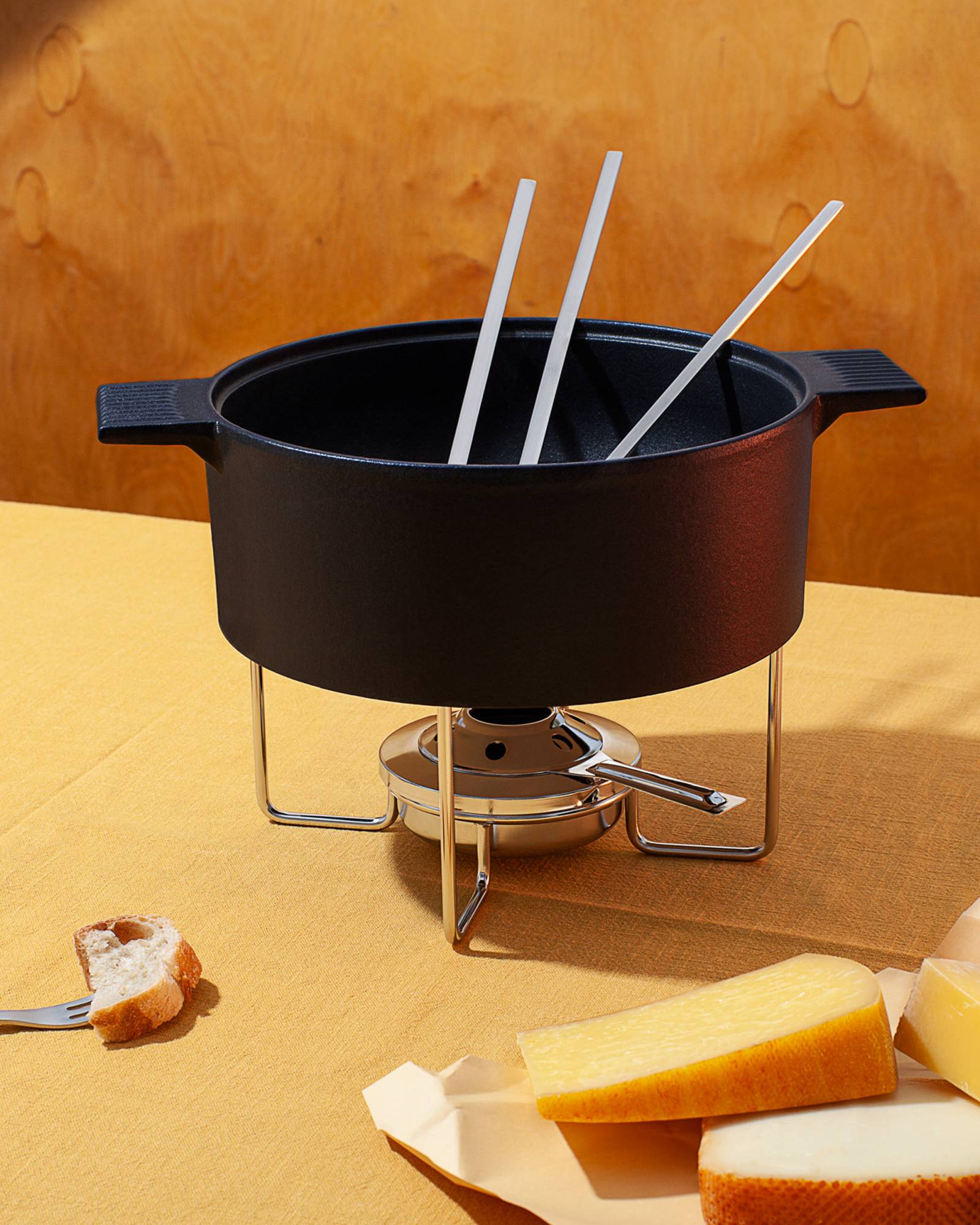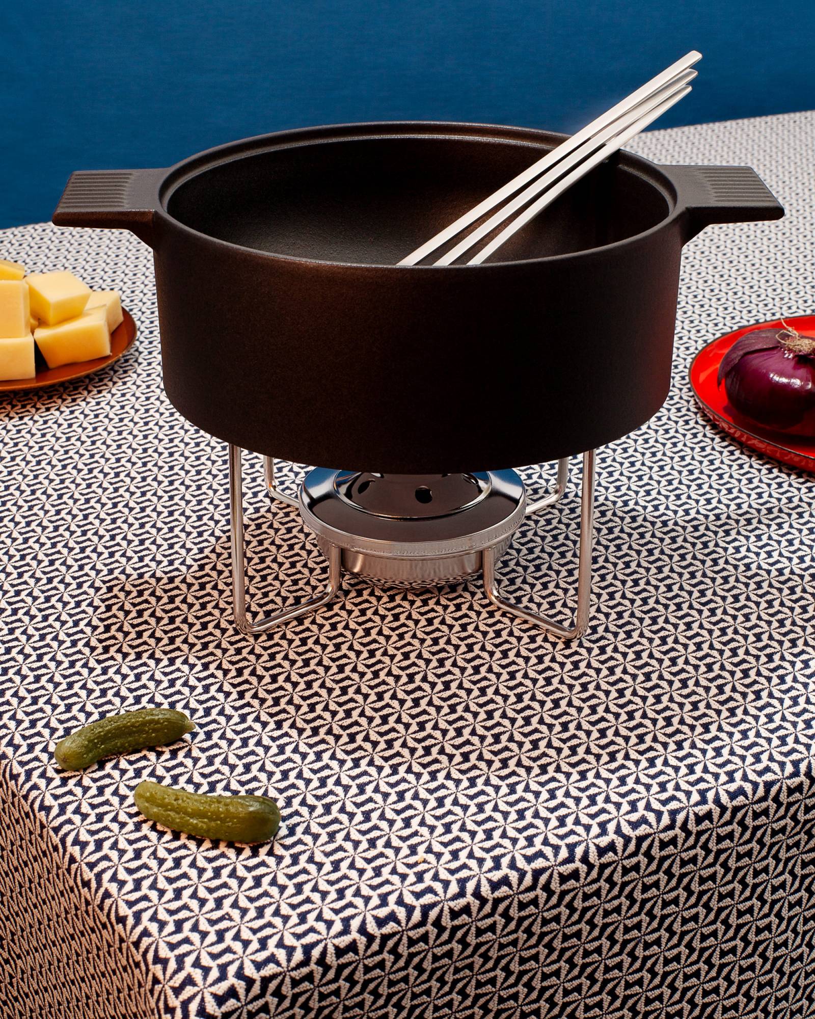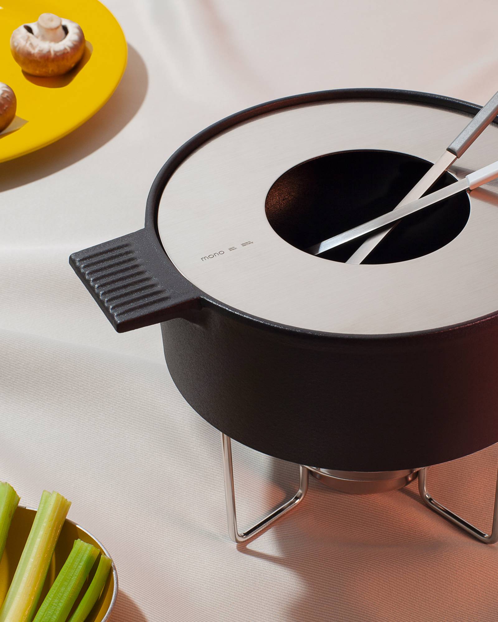 The Mono Fondue is a true centerpiece created by designer Mark Braun, who has already developed the re-edition of the Mono Ring flatware with his Berlin Studio in 2018. With the Mono Fondue he succeeds in creating an extraordinary combination of strength and lightness. The solid cast-iron enameled pot literally floats above the table and safely supported by a fine wire construction. Outwardly, the pot speaks a clear straightforward language, and on the inside it hides a well thought-out soft curve that proves its advantages both while using and during cleaning after use.