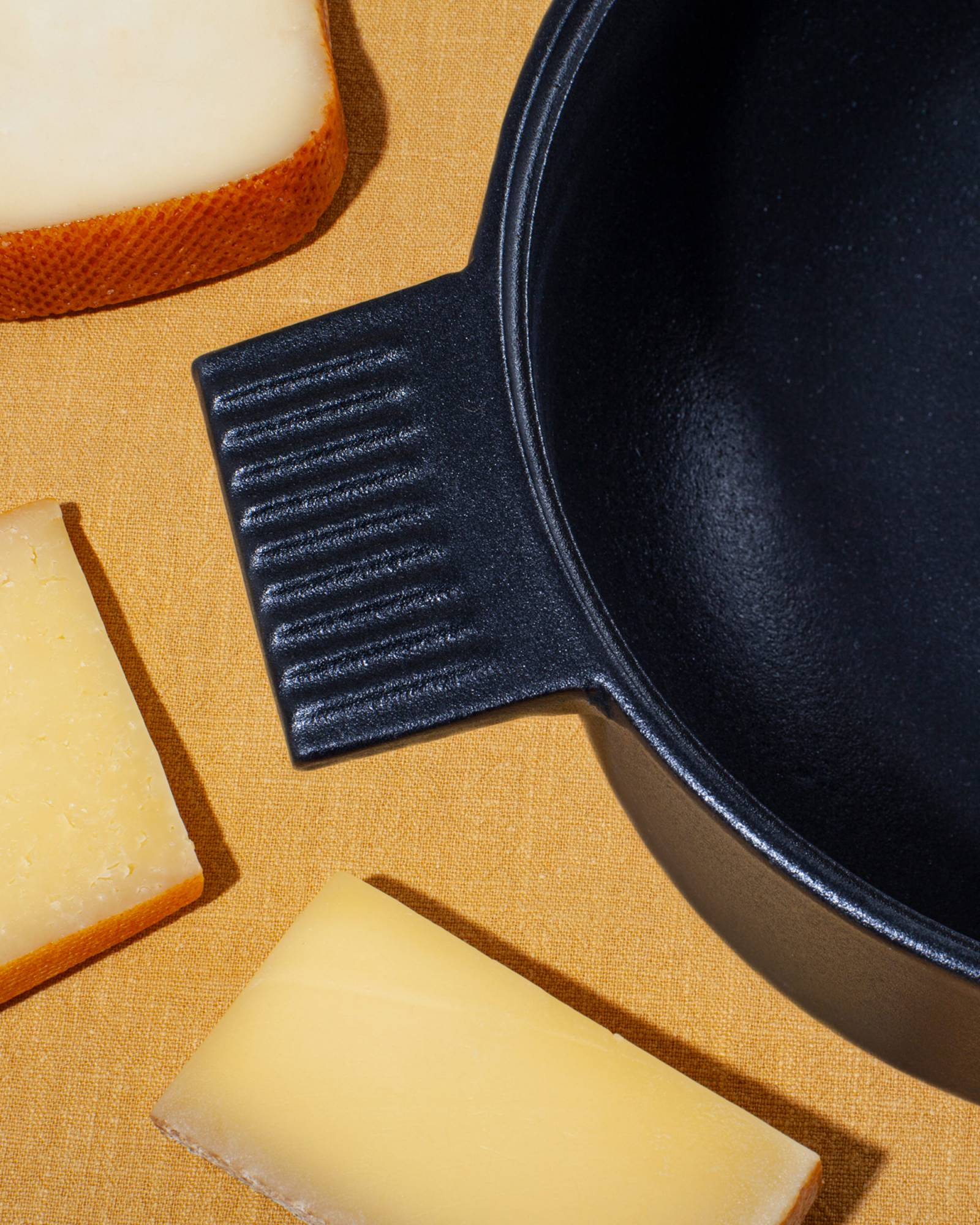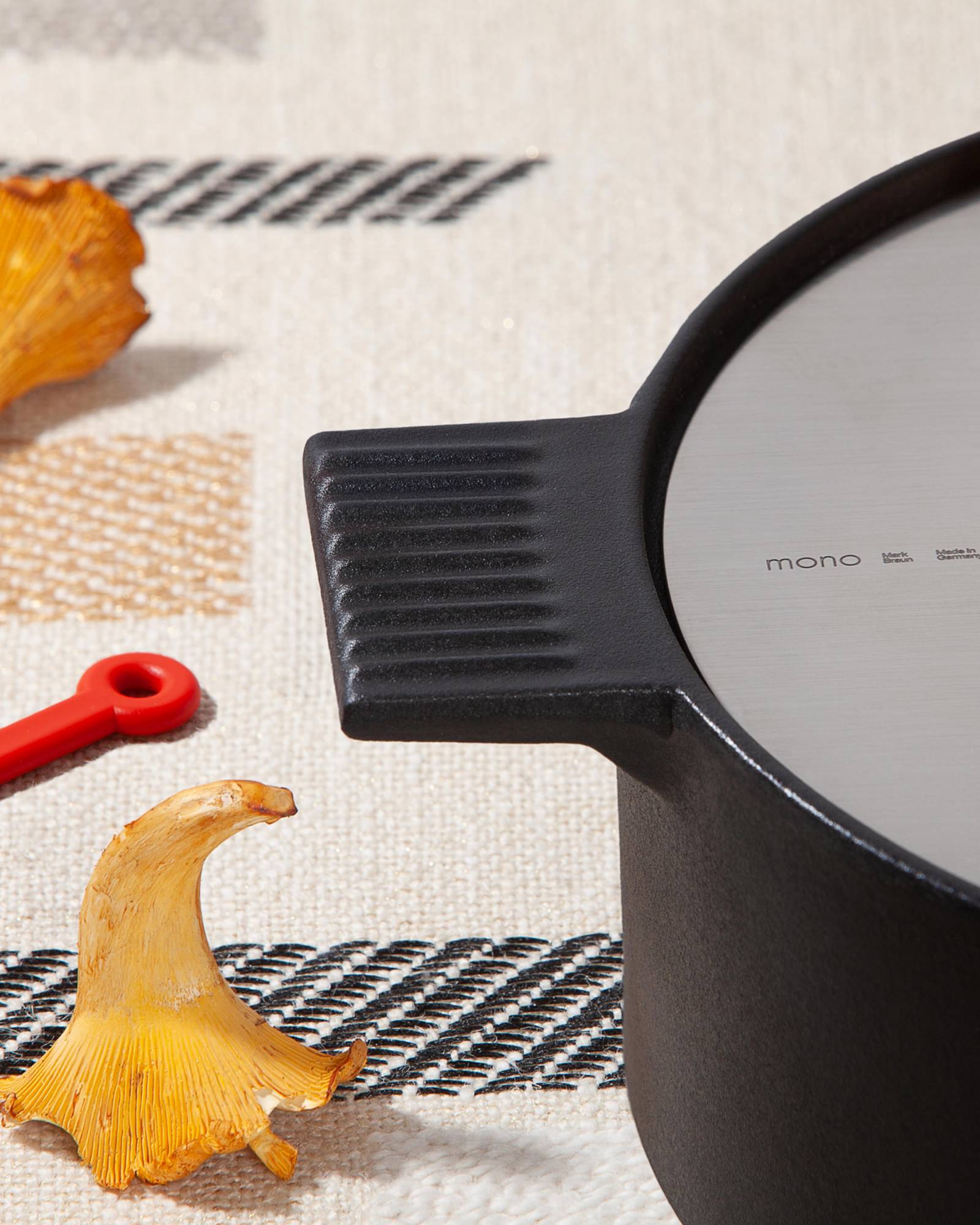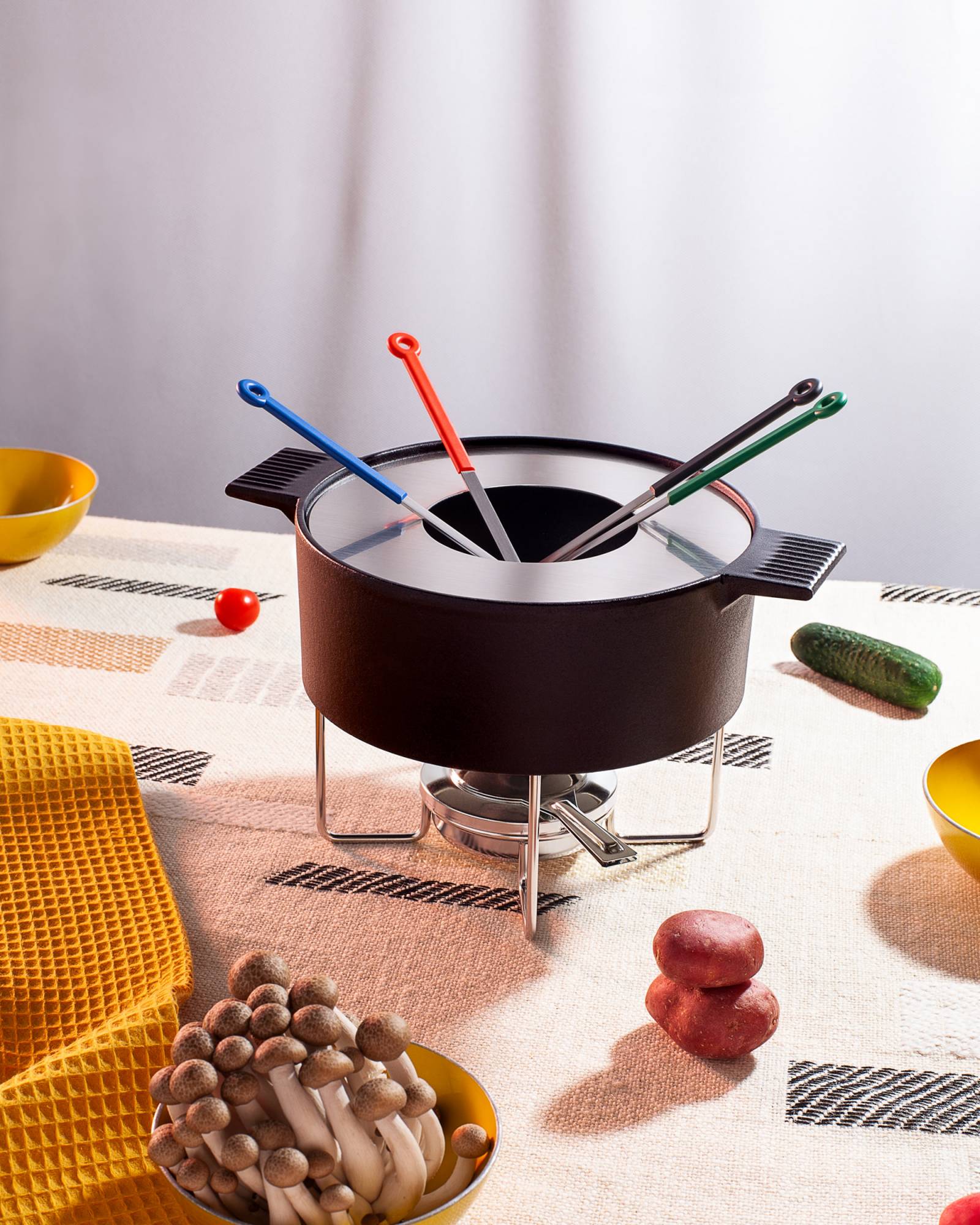 The Mono Fondue is a true centerpiece created by designer Mark Braun, who has already developed the re-edition of the Mono Ring flatware with his Berlin Studio in 2018. With the Mono Fondue he succeeds in creating an extraordinary combination of strength and lightness. The solid cast-iron enameled pot literally floats above the table and safely supported by a fine wire construction. Outwardly, the pot speaks a clear straightforward language, and on the inside it hides a well thought-out soft curve that proves its advantages both while using and during cleaning after use.
