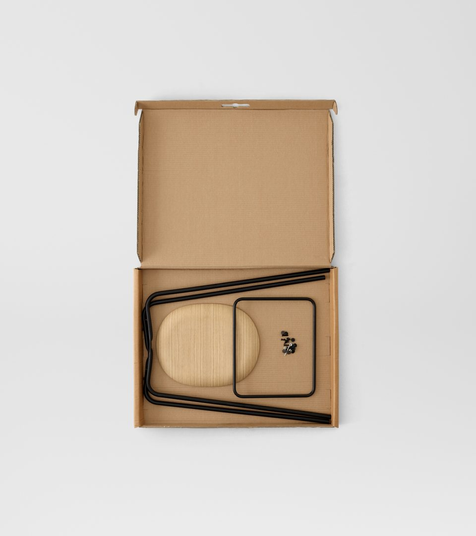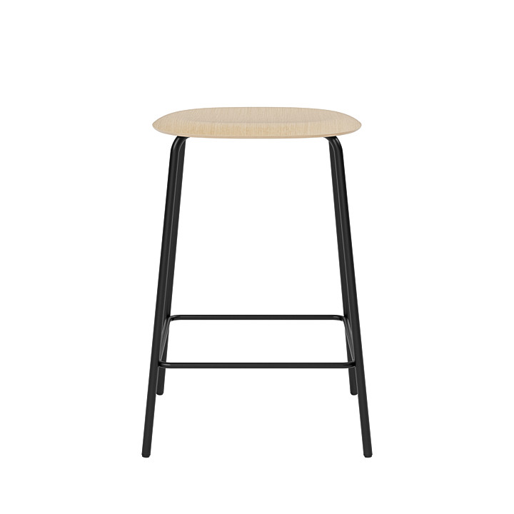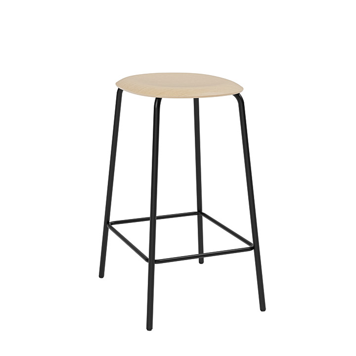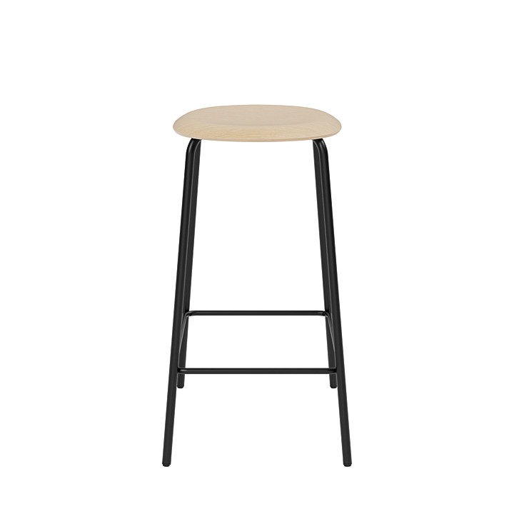 Studio Bar Stool incorporates a frame made of recyclable high-pressure steel with a sturdy black powder coating that adds a graphic and elegant expression. The seat is made from molded veneer: a durable material with a natural weight that lends authority to the design. Our products are FSC-certified. FSC-certified forests are given time to naturally regenerate, local wildlife is sustained and worker conditions are balanced. Oak has a characteristic structure that gives a beautiful texture and a familiar tangibility to the surface. The surface is treated with natural white-pigmented oils (Smoked oak and natural oak) and water-based lacquer (Oak black). An oil treatment allows the wood to develop a characterful patina over time, and will also enable you to easily repair damage to the surface by applying light sandpaper and a new oil treatment – again and again.