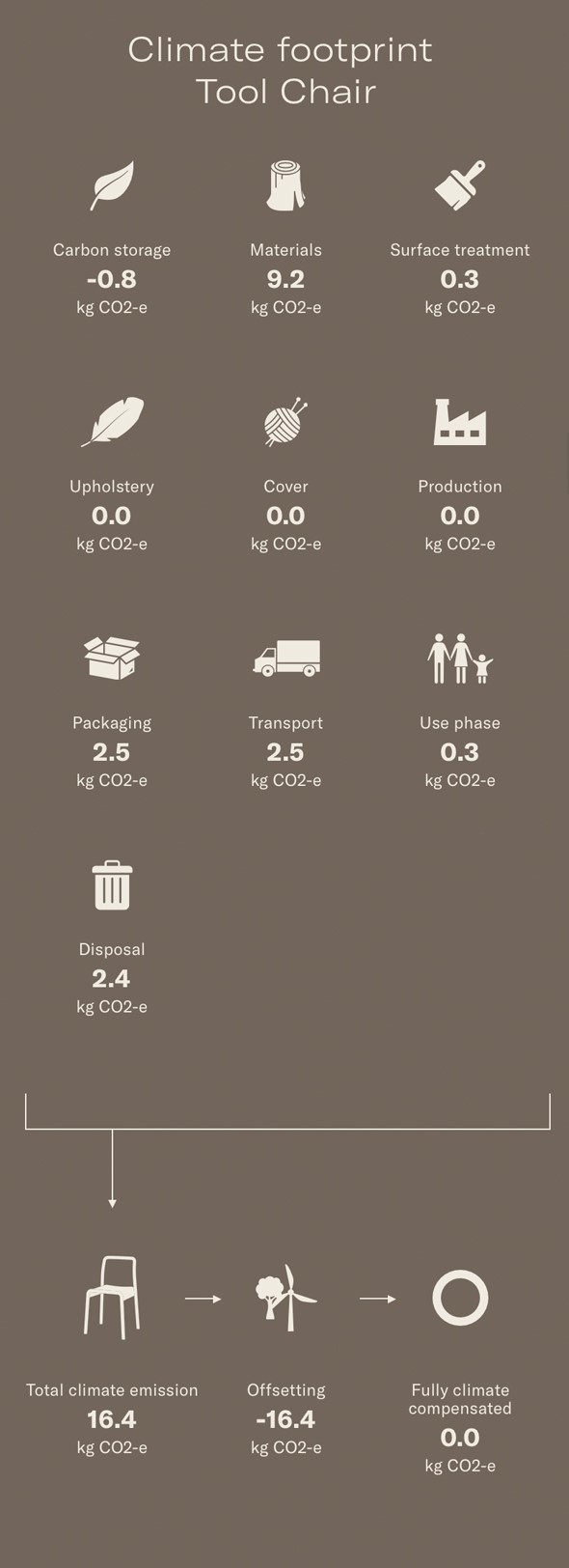 Tool Chair is produced using wood from sustainable forests and the full supply chain of Tool Chair is certified. This means that the forests are given time to naturally regenerate, local wildlife is sustained and worker conditions are balanced.